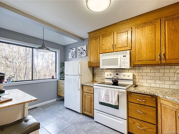 This is the townhouse you've been waiting for!!! Everything has been updated. Kitchen offers new tile, new backsplash, granite countertops, eat-in dining area with cathedral ceilings & large window providing maximum natural lighting. Gorgeous wide plank natural hardwood floors installed on both levels, dining & living room are an open concept providing a great spacious feel. Cozy up to a wood burning fireplace. Slider doors with built-in blinds lead to a multi-level trex deck & tall white privacy fencing on each side along with a stone wall. Other great features include central air, lots of storage, finished basement, attached garage, separate laundry room & large master-bedroom with walk-in closet, beautiful new bathroom vanity & new wall tile, ALL lighting throughout has been upgraded to LED, low utility bill & low monthly association fee covering snow removal, lawn maintanence, garbage removal & exterior building care & insurance. EASY living at its BEST! A MUST see! FHA APPROVED.