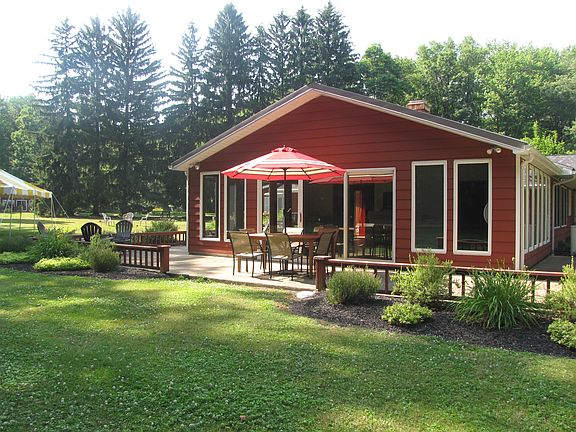 Thriving Grand River vacation rental. 27 wooded acres, over 600' Grand River frontage. Units located 1/4 mile off road - very secluded and private. 10 minutes from Grand River Valley wineries, with easy access for taxi and limo services for winery and covered bridge tours. All contents/appliances/supplies remain for purchaser to continue rentals. Includes canoes, golf cart, cleaning/lawn equipment. All units remodeled 2010. 3,000+ sq. ft. main unit with two-car attached garage features 24' x 30' event room, professional series kitchen, 3 beds/3 baths, wood burning stone fireplace. 1,200 sq. ft. secondary unit features 2 beds/1 bath/ kitchenette, pool table, gaming table, vintage pinball machine, wood burning fireplace. 3rd unit is a 500 sq. ft. studio featuring 1 queen bed/1 bath, kitchenette and wood burning stove. Exterior buildings include: heated pole barn, workshop, one-car storage shed, and greenhouse. Covered porticos between the exterior buildings for wood storage, boat storage and additional outdoor activities. Great customer base, with major potential for growth into corporate retreat/event hosting, or bed and breakfast. Currently run as vacation rental only. Serious inquiries only, with desire to continue with business.