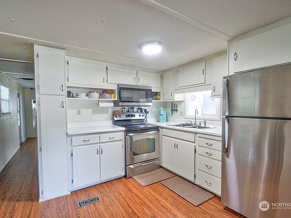 Very Affordable home in 55+ Sought after community in Tumwater Home is in Great condition. beautiful 2 bed 1 bath home is sitting on nice large lot. Garage recently Re-roofed, Brand New shower installed as well as Toilet and sink, Brand new washer and dryer, Wider front door installed, New kitchen sink and faucet along with new refrigerator Brand new flooring all throughout home with a new ceiling fan. Fresh paint throughout and new bright lighting This home is ready for its new owner. Community has a clubhouse and is conveniently across the street from your spacious corner lot.