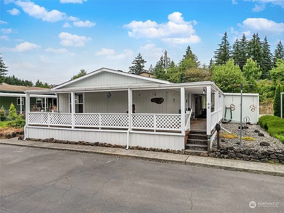 BRAND NEW ROOF! Gorgeous and large wrap-around porch at this 3 bed, 2 bath, 1404 sqft double-wide home in the 55+ Tumwater Mobile Estates. Beat the heat with the heat pump. New Roof installed July 2024! Kitchen opens into living room with vaulted ceiling. Office off the living room in addition to the bedrooms. Convenient in-unit laundry room. Primary bedroom features ensuite bath and walk-in closet. Seller has flooring matching living room, enough for primary bedroom. Low maintenance yard and a private carport. The 8x12 shed could be extra storage or a workshop. Easy access I5 and bus route 12. Minutes from Costco, shopping, dining, and more! Lender financing options available.