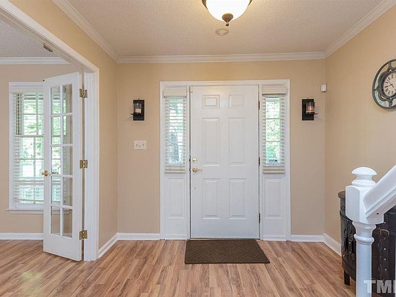 Wow what a price! Great home w/fenced yard convenient to I540, RDU, RTP & shopping. Formal living w/French doors, dining rm has bay window. Spacious family rm features a gas log masonry frpl & vaulted ceiling. Cook friendly kitchen has solid surface counters, plenty of cabinets & breakfast area w/access to the oversized 2-tiered deck. Master bedroom has walk-in closet & private bath. Lrg bonus rm w/walk-in closet-could be 4th bdrm. Rocking chair front porch. Community pool, tennis, playground, volleyball!