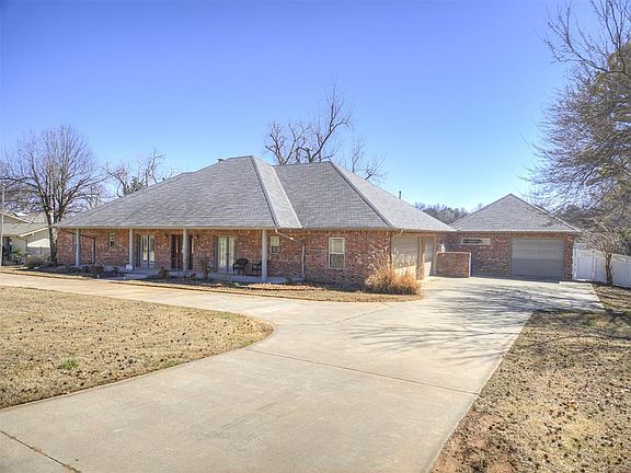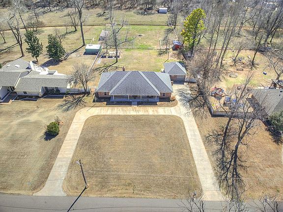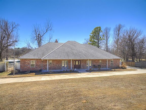 Welcome home to 4.88 acres in town!! This beautiful home consists of a flexible floor plan including 4 bedrooms, 3 full bathrooms and a powder room. The 4th bedroom can be set up for an office/ den. Welcomed by a large circle driveway that can fit 10-12 cars and a 4-car garage or 3 cars and workshop. The workshop garage is a pull through with an overhead door on the front and back of the garage. Tile flooring throughout the entryway into the open living area with a large stone fireplace and throughout the kitchen. Over-sized dedicated dining room with hardwood flooring and high vaulted ceiling to entertain the family and guests. The kitchen includes a breakfast nook overlooking the backyard and pastures. Beautiful granite countertops with a kitchen serving island to prepare food and entertainment. Beautiful cabinetry and crown molding throughout the kitchen and house. It has an oversized primary bedroom and ensuite with walk in shower, large bathtub and granite counter. Large guest rooms each include a full bathroom. The 4.88-acre property includes 4 outbuildings divided into 3 separate pastures perfect for horses or cows. Extra-large outdoor concrete patio that is pre-wired for a hot tub overlooking the pasture, perfect for your morning coffee and entertainment. The home also includes an above-ground storm shelter safe room. The house is in the Carl Albert School District, less than 10 minutes to Tinker AFB, and less than a 3-minute drive to John Conrad golf course.