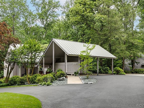 Custom mid-century home in the heart of walkable Bon Air! This lovely home was designed and built by a local architect in 1972 as his principal residence and it is the epitome of MCM architecture with its clean geometric lines and intentional connections to nature. The current sellers bought the home from the original owner in 2020 and made extensive updates while honoring its rich design. Sited on a tranquil .68-acre lot, the home blends perfectly into its surroundings. Updated landscaping and gabled roof lines welcome you into the vaulted first level where the ceilings soar to 21 feet. The large living room features a beautiful wood stove and opens to a cantilevered deck overlooking a rock lined creek. The renovated kitchen features cherry cabinets and a waterfall island that seamlessly connects to the private outdoor living area. An open staircase takes you to the second level bridgeway that leads to a spacious primary with updated bath and second brand new bedroom and bath. The lower-level features two bedrooms, a renovated bath, a comfy den, and tons of storage. Step outside to expansive outdoor living areas, a lofty carport, a creek-side fire pit, and a detached workshop with heated/cooled loft office. Experience a deep sense of privacy and connection to nature all with the incredible convenience of Bon Air. Newly added sidewalks connect the neighborhood to the Bon Air Community Association, parks, shopping (Trader Joes, Gelati Celesti, Perk Coffee, Genovas Pizza, Joe's Inn, and more). Check out the list of features/updates and come see this gem!