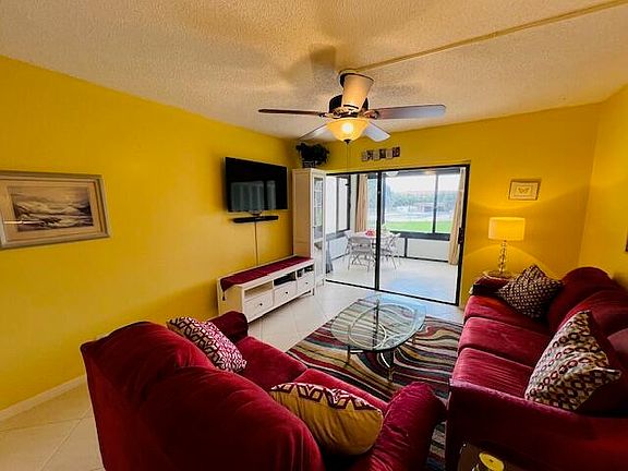 This beautiful condo offers stunning views of the expansive green space and pool, featuring a large Florida room with hurricane impact windows. Bright, spacious, and move-in ready, this unit includes newer AC (2019) and a generous walk-in closet, and it is available furnished. Located in an all-ages community with a secure entry lobby, the building provides extra storage on the same floor. Monthly fees cover cable, internet, water, sewer, trash removal, and pest control. Enjoy access to a community pool and tennis courts for your leisure. A new roof has been recently installed. Water heater 2015, GE breaker panel, parking space # 79, storage unit # 078. This is an interior unit.