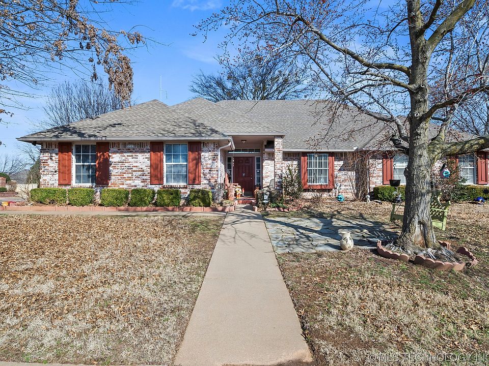 Full Brick, corner lot, one story home in highly desired, mature neighborhood. Home offers wide front entry into spacious family room with vaulted ceiling and beautiful gas fireplace for a focal point. Natural lighting throughout home! Living area opens 3/4 into kitchen and breakfast nook. Tile and Wood flooring throughout home....NO carpet. Spacious kitchen with abundant natural light, numerous amount of cabinet & storage, granite countertops, large working island with additional storage space below. Roomy master suite with whirlpool tub. Office or can be converted to exercise, craft or 4th Bedroom. Privacy fence, mature trees, sprinkler system and leaf guard gutters.