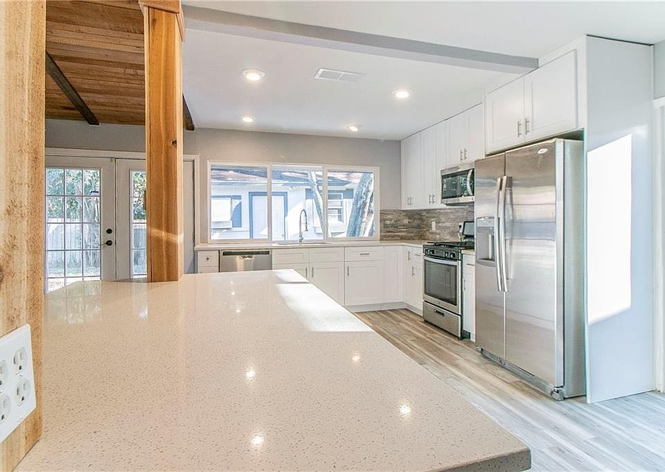 Charming Remodel in North Central Austin's Quail Creek just minutes to Mopac, IH35, 183, Domain. This 3 bed-2 bath home features a modern kitchen with stainless steel Whirlpool appliances, Quartz countertops, cabinets with an island, bar, floor to ceiling stone fireplace, waterproof luxury vinyl flooring, fresh int-ext paint, floating vanities, walk in shower, too many upgrades to list. In the backyard, a remodeled guest casita that can be used for storage or for rent.