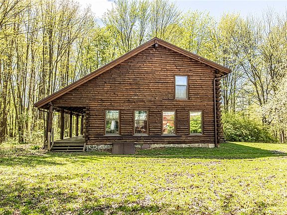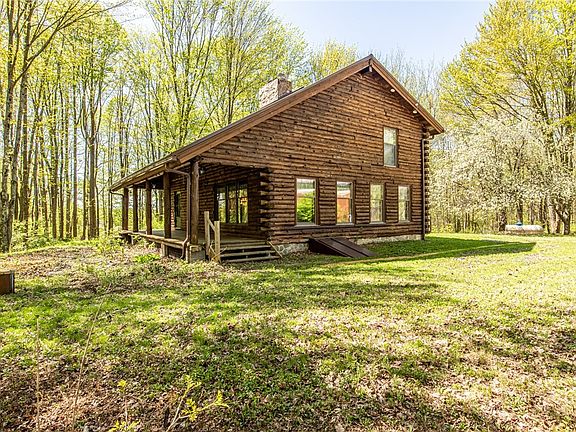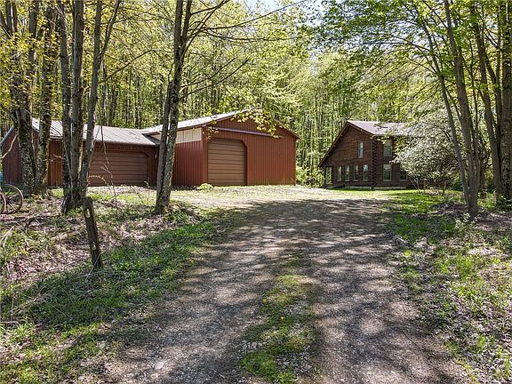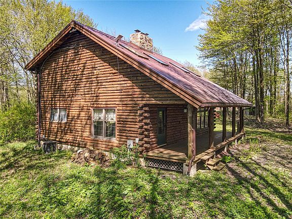 Welcome to the country cabin you've always dreamed of! The rustic charm is everything & more that you hoped it would be! Tucked back in the woods on just over 12 mostly wooded acres, this place is truly one of a kind. Vaulted ceilings in the master bedroom spilling into the first level where the living area is paired with multiple skylights which allows for abundant natural light to shine into the home. New metal roof on the home in 2024. The very spacious, open floor plan on the first level is inviting & makes it easy to entertain guests. Newer hot water boiler system is the primary source of heat along with 2 wood burning stoves for supplemental use. Lower level contains a kitchenette & also has outside entry (bilco doors). Sit on the covered back porch & relax as wildlife strolls through the timber behind the home. The garage/outbuilding has two sections being 24x24 + 40x30 with high ceilings. Property is currently enrolled in clean & green for lower taxes ($3,572.37 for 2023/24)