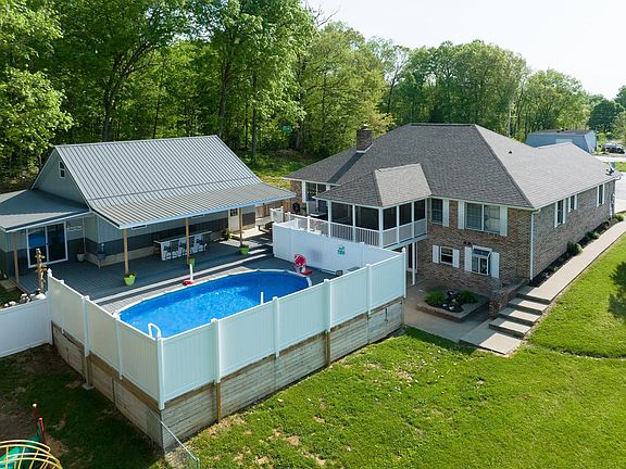Custom built brick ranch home over full walkout basement located just south of Bedford, right off Hwy 37 S. Quality construction built in 1992 with custom features throughout. Main level has a split floor plan with the 22x14 master ensuite that features a walk-in shower, double sinks and plenty of closet/storage space. Two additional bedrooms with spacious closets share a full bath. Kitchen boast custom features such as the solid surface counter tops, island with seating for 4, stainless appliances and a walk in pantry. Formal dining room has plenty of natural light from skylights in the ceiling. Family room has a beautiful wood burning fireplace. Main level laundry room with stackable washer/dryer. Screened in 13x12 area that leads to a private oasis for your relaxation or entertaining needs. Your guest will enjoy the above ground pool, outdoor bar with seating and firepit area the perfect combination for summer nights. Detached pole barn has two double doors, above storage area and living space in the rear with a full bathroom with heat and AC. Lower level of home is currently being used as a daycare with 1880SF, full kitchen, laundry area and 3 additional rooms. This property is a special find for sure, call today!