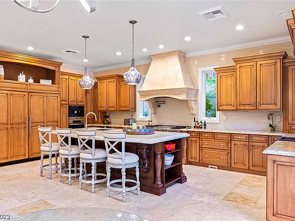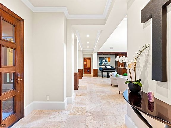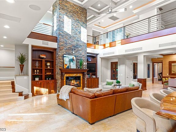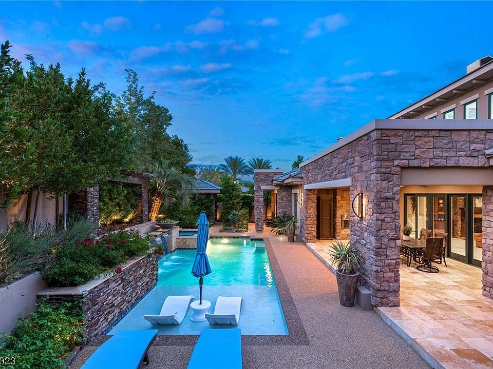 Stunning one-of-a-kind custom home in the desirable guard-gated community of Canyon Fairways, in Summerlin! Impressive curb appeal leads to the grand entry, with breathtaking high ceilings and open floor plan that is an entertainer’s dream.Exquisitely curated finishes w/ custom solid wood cabinets, granite counters, Wolf oven, built in Miele coffee maker, Sub-Zero refrigeration & large NEW Polished Quartzite Kitchen Island. Featuring a first-floor master bedroom, junior suite & movie room with updated sound system.Impressive two-story stone fireplace & magnificent custom bar complete with Onyx countertops and Sub-Zero wine fridge. Travertine and NEW hardwood flooring throughout. This home features a whole-house humidifier, 2 newer tankless water systems installed, & 5 AC Units. The resort-style backyard offers a covered patio, built-in kitchen, detached bathroom, dog run, PebbleTec deck, & sparkling pool w/ waterfall & spa.Conveniently located near TPC Golf Course.An absolute must-see!