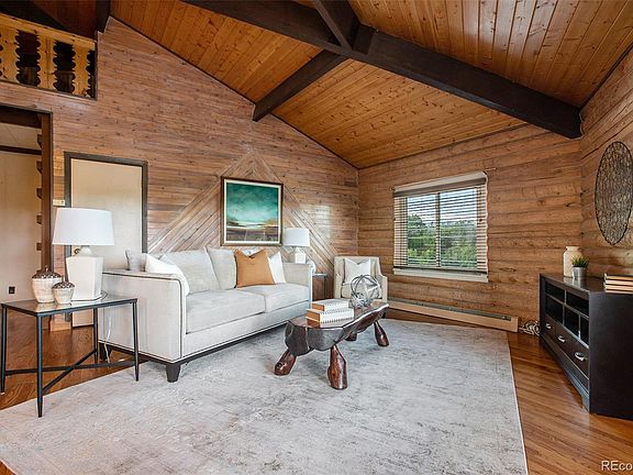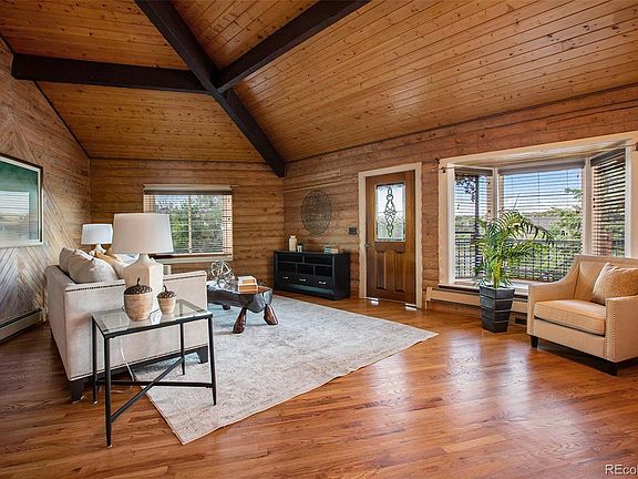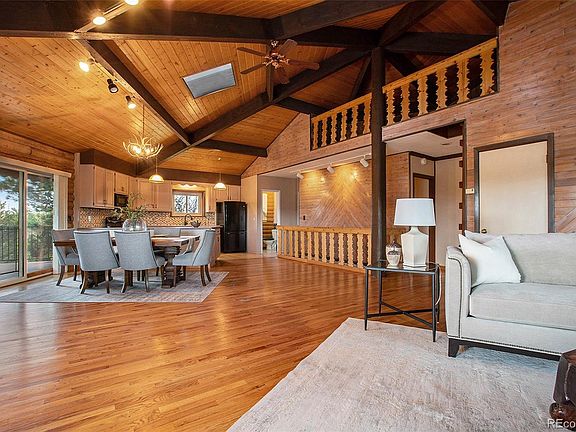 What an amazing opportunity to own a truly unique log home on 1.375 acres nestled into the picturesque landscapes of Surrey Ridge. With its spacious interior and serene outdoor spaces, this residence is truly a hidden gem that you won’t find again in Surrey Ridge for this price. As you step inside, you'll be greeted by an open-concept design that seamlessly connects the living room, dining area, and kitchen, creating a warm and welcoming atmosphere. The living room features large windows and skylights that flood the space with natural light, highlighting the exquisite custom craftsmanship and attention to detail found throughout. Vaulted T&G ceilings with exposed beams and an antler chandelier over the dining room table. The gas fireplace is the center point with a natural river rock surround. Don’t miss the loft area equipped with a fun ladder which makes for a great play area. Upstairs you will find two bedrooms with a shared bath and a Murphy bed. The beautiful west-facing patio was recently re-constructed and features low-maintenance composite decking. The walk-out basement features an additional bedroom, a ¾ bath, a family room, an attached garage, and large storage or shop area. The lower driveway is paved, and you can follow the driveway up to the upper level of the house and park under the carport or continue up the hill to the barn/shop equipped with electrical. Located in Surrey Ridge, this home offers convenient access to a wide range of amenities. Enjoy nearby parks, hiking trails, and golf courses, or explore the vibrant downtown area of Castle Rock with its charming shops, restaurants, and entertainment options. With easy access to I25, commuting to Denver or Colorado Springs is a breeze.
