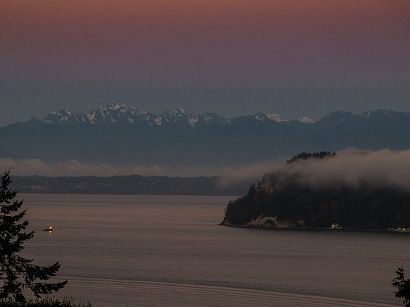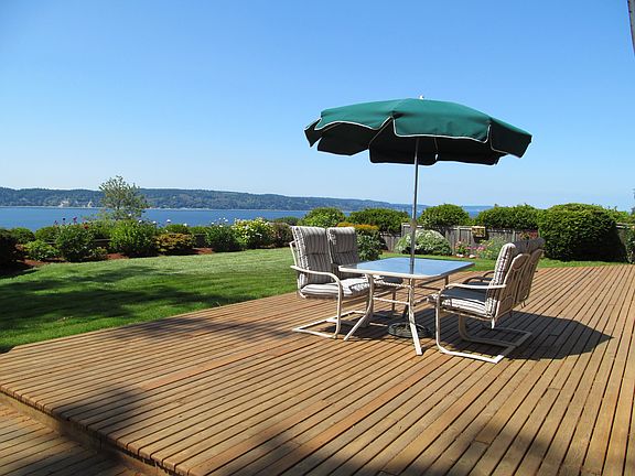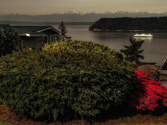 180°Panoramic View: Water, Islands, Mountains. Private luxury home estate-like setting meticulous, landscaped level lot 90'x190' perfectly located at crest of hill Olympus Terrace. Classic mid century style home, beautifully remodeled 1998 has one level living. Expansive kitchen & dining areas adjoin living rm, family rm & office. View deck runs parallel with wall of windows facing the Sound. 4 bedrooms, 2.5 baths, attached 3 car garage & work area(1998). Sought after neighborhood & schools!