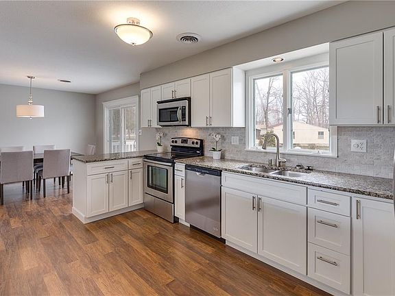 Completely renovated home, inside and out! All new interior, including kitchen cabinets, flooring, paint, bathrooms and lighting. New roof, gutters and downspouts, newly landscaped by Alwerdts Gardens, new concrete path to boat dock. This home even comes furnished! Full stainless steel kitchen appliance package and granite countertops with beautiful ceramic backsplash. Bathrooms have new flooring, cabinetry and granite counters. New tiled shower in the main bath. Nice and open floor plan. Gas fireplace. Lower level includes large family room with new wood looking tile, nice bedroom and remodeled bath. Lower level opens onto nice screened porch. Attached single car garage with detached single car garage and extra storage shed. Great northside location and fantastic price for waterfront property in this condition!