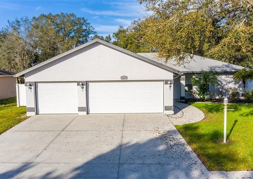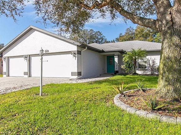 Welcome home to this quiet community, North Oaks Estates, conveniently located off Moccasin Wallow near I-75 and US 41. This three bedroom two bath, split plan offers one of the few available third car garage options in the neighborhood. Upon entrance enjoy the open living room, bonus space, and eat-in kitchen. The owners suite contains a walk-in closet, stand alone shower, double sinks, and a garden tub. The two bedrooms on the opposite side of the house offer easy access to the laundry room and second bath. Extended screened in lanai with fully fenced back yard and outdoor workshop, make this house great for entertainment. New A/C has been replaced in late 2019.