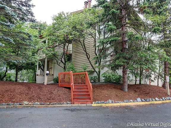 Top floor unit, the living room has vaulted ceiling, and a fireplace, lots of light. Large master suite with private bath. Peaceful setting. 2 parking spots in the garage and large storage room. Close to Kincaid Park walk to shopping center.