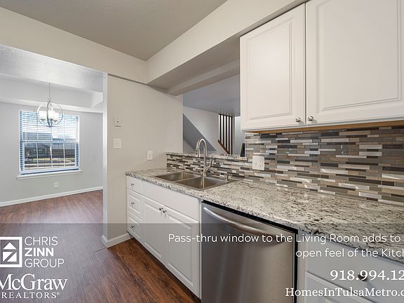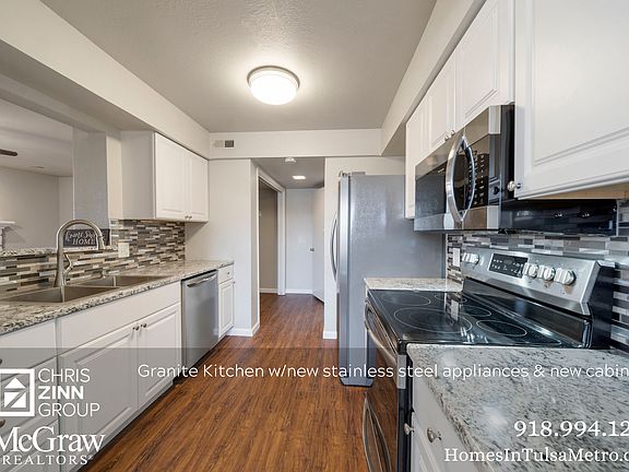 Beautifully Remodeled in South Tulsa! Corner unit in quiet gated community w/pool & clubhouse. New paint, flooring & lighting throughout. Granite Kitchen w/new SS appliances & new cabinets. Large Living w/FP, Dining Room & Half bath down. Master Suite up with huge walk-in closet and updated Master Bath w/walk-in shower. Additional Bedroom Suite up w/private bath & walk-in closet. Covered balcony off Master w/storage closet. Partially covered courtyard w/privacy fence. Covered parking. Cable included.