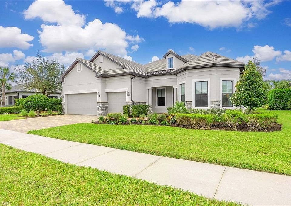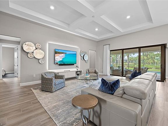 In a gated North Naples community, this meticulously maintained Pinnacle model is offered turnkey furnished and features three bedrooms, three full baths, a private den and a three-car garage. Enhanced by curated designer furnishings and artwork, the residence offers seamless indoor-outdoor living with serene golf course views and resort-style amenities. A spacious great room with a backlit entertainment wall and coffered ceiling opens to the dining area and gourmet kitchen. Designed for function and style, the kitchen features quartz countertops, a tile backsplash, custom cabinetry and premium KitchenAid appliances, including a natural gas cooktop and wine bar upgrade with built-in cooler. Zero-corner sliders extend the open-concept layout onto a covered lanai with an outdoor kitchen with grill, refrigerator and TV, dining space and lounge area with fire table, all overlooking a screened paver patio with a heated pool, spa and fire pit. The primary suite includes a tray ceiling, dual vanities, a soaking tub and a huge walk-in closet with custom built-in cabinetry. A private den with French doors offers flexible use as an office or library. The second bedroom includes a bay window and en-suite bath, while the third bedroom has easy access to the third full bath. Additional features include a well-equipped laundry room with ample cabinetry, epoxy-coated garage flooring, designer lighting and window treatments. In a no-flood zone, this low-maintenance residence does not require flood insurance. The community is in proximity to world-class beaches, upscale shopping and fine dining. This is a rare opportunity to own a fully furnished, move-in ready home with refined finishes, premier amenities and a desired golf course setting in one of Naples fastest-growing areas.