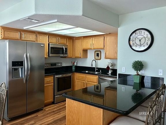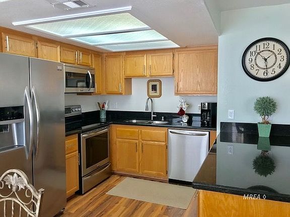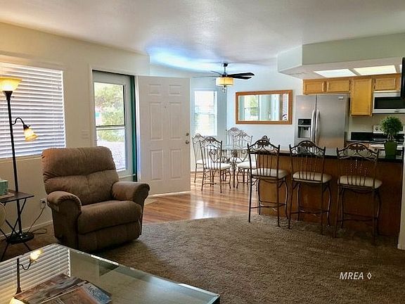 This gorgeous "turn key" Rock Springs condo has been remodeled and is definitely ONE OF A KIND! The close proximity to the community's pool and spa is ideal and the southern exposure of the patio is favorable. This FULLY FURNISHED condo features gorgeous wood laminate flooring, newer Frigidaire Gallery stainless appliances and stunning black granite counter tops in the kitchen. The sink, faucet and garbage disposal have also been replaced. A spacious eating bar is great for entertaining and the dining nook is bright and open hosting a bay window. The entire unit has a fresh coat of paint, new light fixtures, custom ceiling fans, new door hardware, light switches and cover plates. The open floor plan is popular and the two bedrooms are spacious with large closets. Both bathrooms have been updated with tile flooring, new faucets and new comfort height commodes. The laundry nook is convenient with shelving, cabinet space and the washer and dryer are brand new. Newer carpet and a recently replaced water heater are a bonus. This condo is conveniently located to Mesquite's best golf courses, restaurants and entertainment. Move right in!
