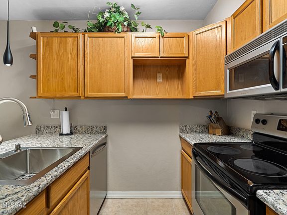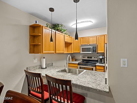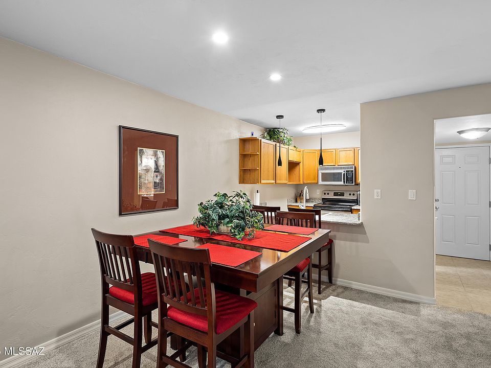 Imagine waking up each day in a beautifully updated condo just moments away from the UofA!This 1,086-square-foot, two-bedroom, two-bath home in the Campus Walk community at Costa Del Sol offers more than just proximity to campus; it's a lifestyle. From the moment you step inside, the attention to detail and modern upgrades invite you to settle into a space designed for comfort and style.The living room is a peaceful retreat with recessed dimmable lighting that adapts to your mood, fresh paint and trim for a polished look, and upgraded carpeting that adds warmth. Large sliding glass doors flood the space with natural light and open to a private balcony overlooking the sparkling pool--a perfect place to enjoy Tucson's beautiful weather.Click More. Adjacent to the living room, the dining area provides a seamless flow for entertaining or quiet meals at home. With dimmable lighting above a breakfast bar and thoughtfully chosen finishes, it's an inviting spot for casual dining or working on a project. The upgraded kitchen is every home chef's dream, featuring sleek stainless steel appliances, an extended granite countertop, a deep 24-inch stainless steel sink, and all-new fixtures and plumbing.