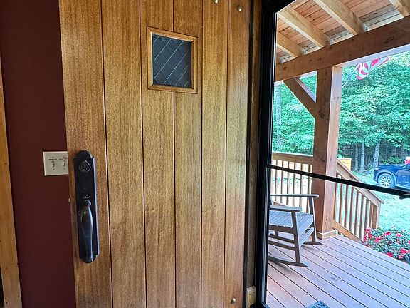 Impeccably constructed, this custom timber frame home boasts 3 bedrooms, 2 baths, with locally sourced hardwood flooring and pegged beams. Step in from the covered front porch into a tiled mudroom entry. The kitchen is equipped with a gas range, farmhouse sink, center island, and stylish open shelving. The dining area and living room exude coziness with the warmth from a pellet stove, vaulted wood ceilings, and stunning windows inviting natural light and showcasing the rich wood details and beams. A generously sized rear deck that beckons for leisurely evenings. The first floor also hosts a bedroom and hall bathroom. Upstairs, the large second bedroom features a roomy walk-in closet. The third bedroom loft is enclosed by elegant drapes for privacy. Additionally, there is a full bathroom with double sinks and a concealed washer and dryer for added convenience. The lower level is a walk-out basement with double doors and provides ample room for utilities, storage, and workspace. Heating and cooling is not a problem with propane-forced hot air and two mini-split units. Outside, a stone fire pit and two large sheds complement the home's appeal. With its resilient metal roof, quality Anderson windows, classic cedar siding, and sturdy large steel I-beams, this home is a true testament to quality and attention to detail. Thoughtfully positioned deep on the lot for privacy and being sold with the undeveloped adjacent lot. Direct access to local snowmobile and ATV trails.