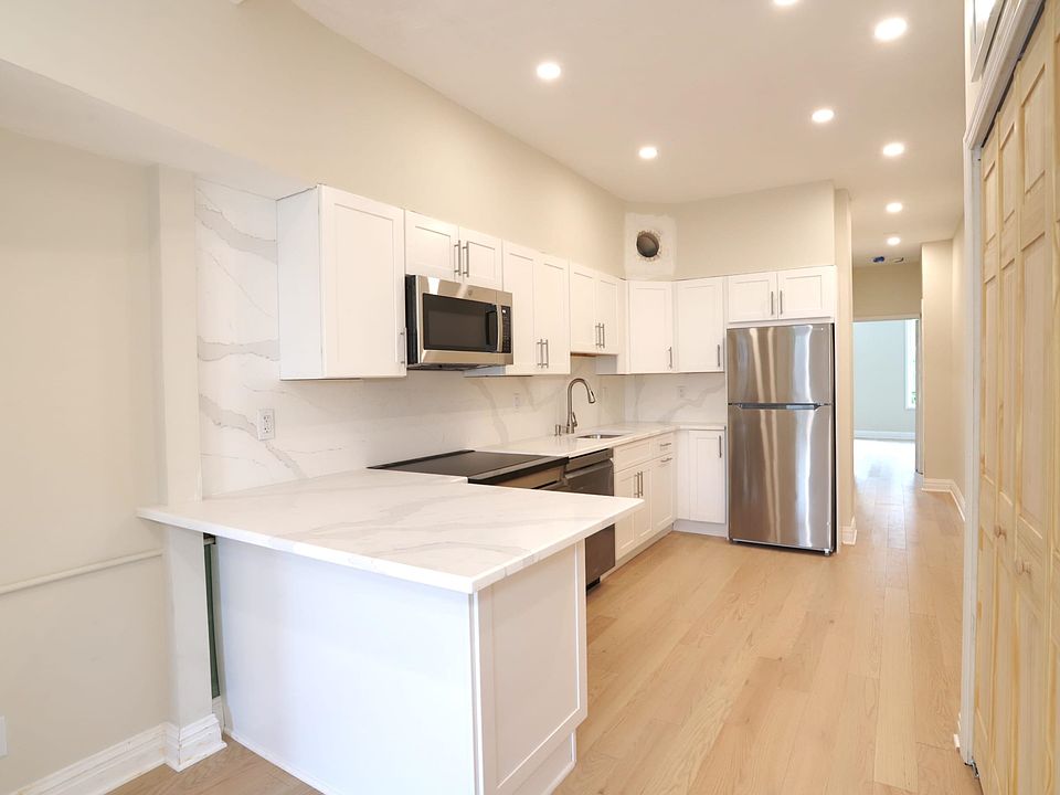 Step into this stunningly renovated and freshly painted one-bedroom, one-bathroom apartment featuring hardwood floors and central air conditioning. Situated on one of Hoboken's most desirable streets, this home offers both style and convenience. The kitchen boasts brand new modern appliances and elegant quartz countertops. The spacious master bedroom highlights a charming exposed brick wall, while large windows flood the space with natural light. A generous walk-in closet provides plenty of storage. The shared backyard with a patio is ideal for entertaining. Laundry facilities are available in the basement. Located near transportation, parks, grocery stores, and restaurants, this apartment is in an ideal location.