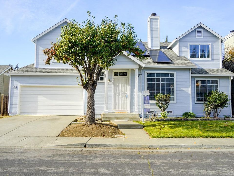 Step inside this beautiful move-in ready home at the Estates! As you enter you will be greeted with a spacious living room and dining area. The separate family room is large with a cozy dual fireplace for both the living and family rooms. This freshly painted interior and exterior home features 4 bedrooms, two and a half bathrooms, new carpeting throughout the upstairs, including primary bedroom and bath. Lower-level features an eat-in kitchen with pantry cabinets. The private rear yard has been recently graded and is ready for your imagination. The house also includes a leased solar system that reduces your electric bill and carbon footprint. New water heater installed in November 2023. Restaurants and shopping center nearby, minutes to Travis Airforce base, David Grant medical center and Hwy's 12/80/680.