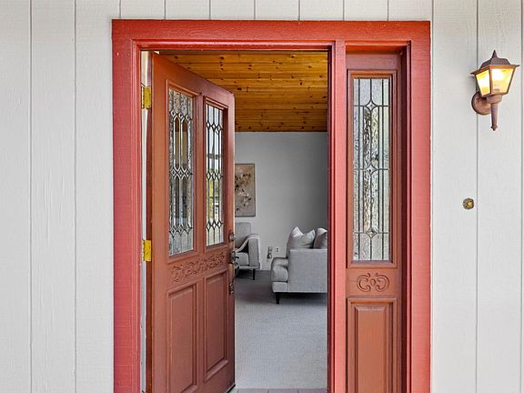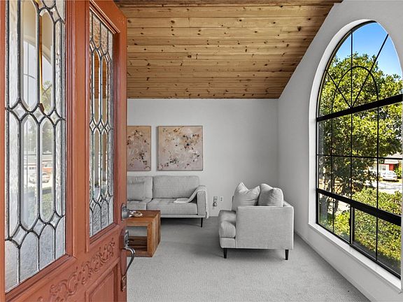Striking home features include dramatic vaulted ceilings with beautiful wood planks and exposed beams, abundant natural light from large windows and glass doors (including a floor-to-ceiling Palladian window), newly painted crisp white walls, new Berber carpet and on-trend light fixtures, a sleek marble fireplace, a rugged stone fireplace, and seamless indoor-outdoor transitions to the .25+/-acre lot with decks, lawn and flower beds.