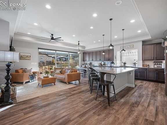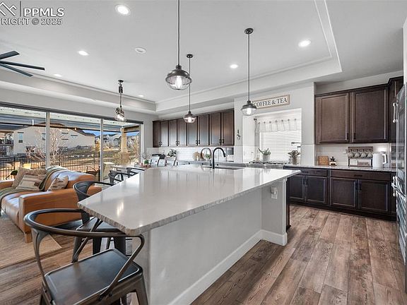 This amazing home in the upgraded and secluded area of Banning Lewis Ranch sits inside the pseudo manned gate building entry to the area and backs to green spaces! It is loaded with upgrades! The covered entry porch leads to either the main guest entry or the multi generational suite separate entry. Step inside to durable wide plank flooring, spacious rooms and full wall sliders with remote control blinds! There is an office/ flex room off the main entry, wide halls and a half bath. The tall ceilings open up to a dream kitchen with 40" upgraded Kitchen Aid gas range, with views out the window. Double ovens, upgraded dishwasher, microwave oven and butlers pantry make cooking an absolute joy! Extended cabinets and a walk in pantry provide ample storage! You will love stepping outside to your private covered patio with extended stamped concrete fire pit area, high end turf, remote control privacy blinds rated to 50 MPG winds and raised bed gardens. This home has it all! The private master bedroom retreat has plank floors, a huge walk in closet, double vanity with quartz counters and a spa like massive shower with tub inside for the ultimate luxury! A spacious secondary bedroom also has plank flooring and the Mother-in-law/guest suite is incredible with sitting area, full wet bar with sink and mini fridge, cabinets and storage as well as the aforementioned private entrance! Heaven! In the 9' tall basement you will find a huge entertainment area for movies and games, three more large bedrooms, a full bath with two sinks and a almost finished work out area with dry wall and flooring! More storage wrapped around behind the utility room off of the workout space! You are going to absolutely love living here! This home is full of the upgrades you have been looking for and is walking distance to award winning schools, the Banning Lewis Community Center and pool and to the area Farmer's Markets! Live the luxury lifestyle you deserve!