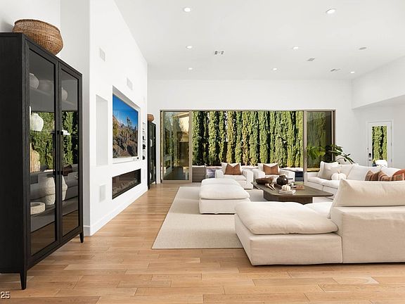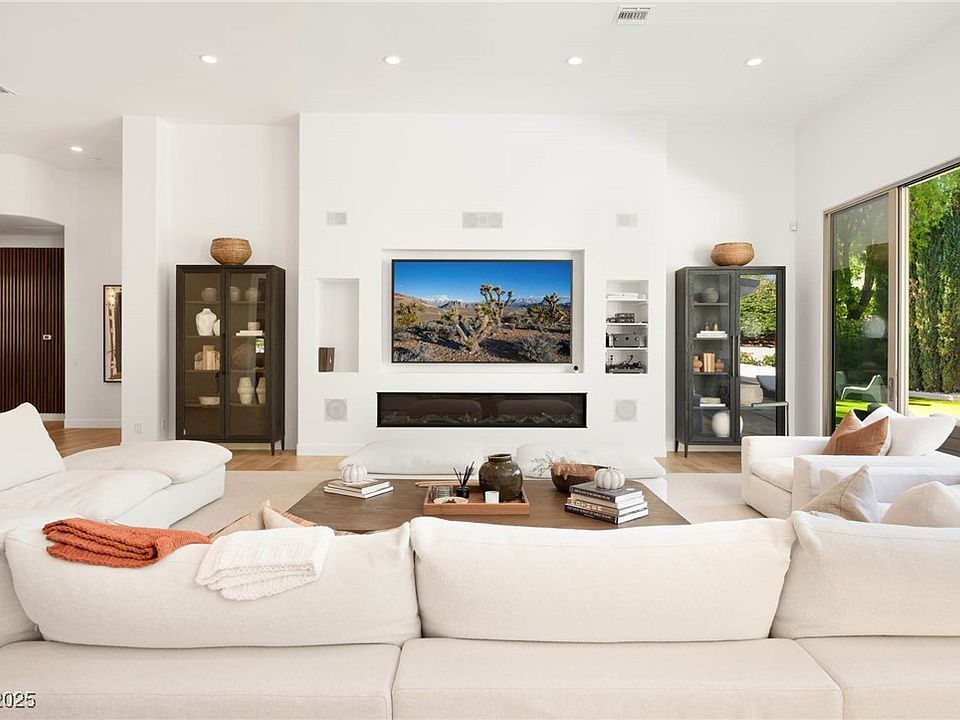 Sophisticated single-story retreat in the prestigious guard-gated enclave of Canyon Fairways. Behind a private courtyard entry, generous interiors unfold with effortless flow between living, dining & outdoor spaces. Floor-to-ceiling glass reveals a sparkling pool & landscaped grounds designed for entertaining. The chef’s kitchen is appointed with bespoke cabinetry, professional-grade appliances & an oversized island for gathering. The owner’s suite features a warm fireplace, boutique-style wardrobe & a spa sanctuary with marble finishes, soaking tub & steam shower. Outdoor living extends with shaded patios, lush gardens & tranquil lounging areas. Canyon Fairways residents enjoy verdant parks, walking trails, tennis, basketball & the security of a premier Summerlin address moments from golf, dining & shopping.