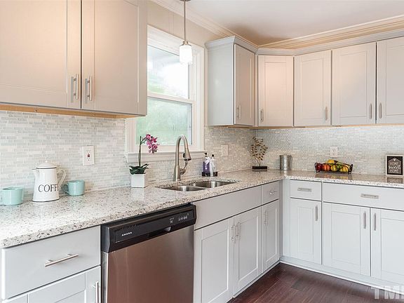 GORGEOUS First Floor Master Home with Rocking Chair front porch on Over an Acre! Features a bright open floor plan and upgrades galore including a custom designer kitchen with new shaker cabinets, granite, glass tile back splash & Stainless Steel appliances. Exotic bamboo flooring in main living areas; NEW plush carpet & designer paint. Master suite with new vanity and walk in closet. New roof, windows, vinyl siding and water heater 2020. Convenient to Downtown Raleigh, 70 and 40. Move in and enjoy!
