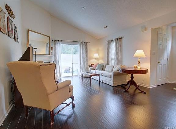 Highly sought after garden end unit with attached one car garage. Attractive curb appeal provided by ~2012 Architectural roof, brick accent, low maintenance vinyl siding, insulated windows, private enclosed patio, & open common area views. Spacious GR layout boasts upgraded laminate floors, vaulted ceilings, elegant neutral decor, two inch blinds, & gas logs. Mechanically superior condition with brand new 2017 AC & 2016 H2O heater. Master BR features vaulted ceilings, WIC, & relaxing garden tub.