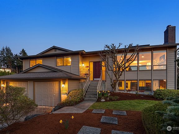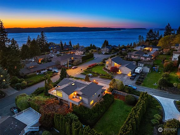 PNW living in this highly desirable Olympus Terrace home, boasting Western views of the Puget Sound, Olympic Mtn Range, and Whidbey Island. Spanning 2,960 sqft, this home offers 4 bedrooms, 2.5 baths, with elegant Minka fans & lights throughout. The family room/home office area creates the perfect ambience for enjoying stunning sunsets, complemented by oversized skylights that bring in an abundance of natural light. The primary bed is complete with an en suite bathroom and a private deck offering private views. The main level hosts 2 additional bedrooms and a full bath, while the lower level includes rec room, bedroom, 1/2 bath, and utility. Mature landscaping surrounds enhancing overall outdoor experience. Award winning Mukilteo schools.
