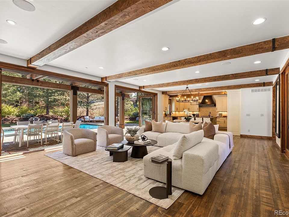 Inside, custom hardwood floors, knotty alder doors, black iron accents and fresh new paint create a warm, refined ambiance. The gourmet kitchen boasts Sub-Zero and Wolf appliances, a spacious walk-in pantry, and opens to a large great room leading to a backyard oasis—complete with a pool/electric pool cover, hot tub, putting green, and al fresco dining.
