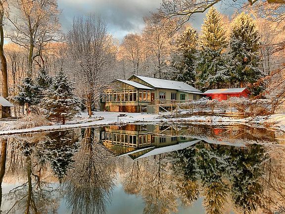 You've found paradise! This spectacular home is sited on 9 gorgeous acres and features your own pond, stream, numerous outbuildings and beautiful gardens. Home features include 10' ceilings, huge decks, covered porch, sunroom, upgraded kitchen, stone fireplace and separate building for hobbies. Option to use driveway to Ford Rd. Subdivision possible. It's like perpetual vacation!