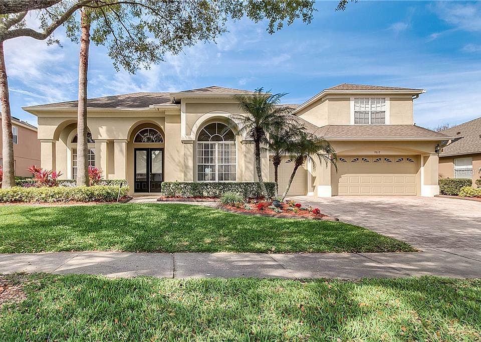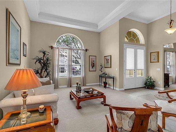 As you enter this meticulously maintained exquisite home, you will be immediately impressed by the beautifully detailed soaring ceilings. The open floorpan allows for everyone to socialize throughout the first floor from the flex room, formal dining, formal living room and spacious family room with wood burning fireplace. Beautiful views of the pool with large covered lanai offers plenty of privacy as there are no rear neighbors. The spacious master suite is located on the first floor with two walk in closets, large shower, garden tub, and dual vanities. This split floorpan allows privacy from two of the additional bedrooms, both with large closets. Bedroom two has a full bath and bedroom three has a full bath with pool access. As you reach the second floor, you are welcomed by your theater room along with a custom kitchenette to complement your movie nights. You will find the 4th bedroom and bathroom off of the spacious loft area. Carpet, tile and beautiful wood floors throughout this magnificent home. This established gated community also offers fitness and fun with tennis courts, basketball court, volleyball, and playground.