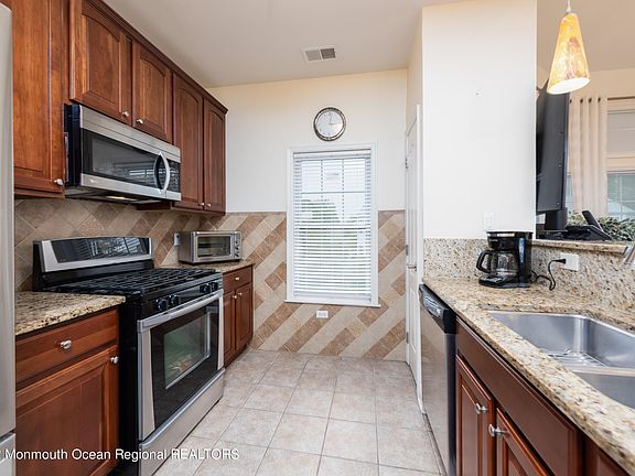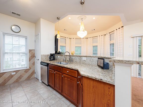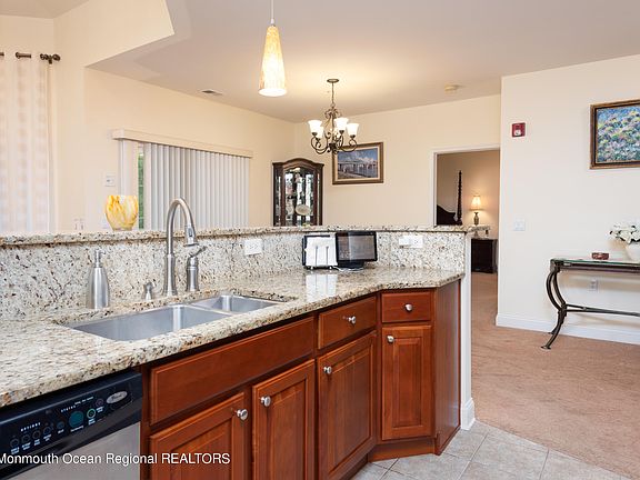 Welcome home to Highly Desirable 55+ Plaza Grande Development. Beautiful spacious Harrington model offered on the market for the first time. Kitchen boasts granite counter tops, tile backsplash and stainless-steel appliances. Spacious living room with stunning wrap around windows, Dining room area with sliders that open to quaint outside deck area backing to woods for complete privacy. Bonus room can be used as a dining room, den, office, or extra bedroom if needed. Large primary bedroom with two large closets, primary bath with cherry cabinets, neutral counter tops, double sinks, soaking tub and separate shower stall. Nice sized second bedroom with sliding closet for guests or family. Home offers, recessed lighting, washer/dryer, amble closets and attached garage with storage. Building offers lounge and gaming/library room for entertaining family and friends. This is a beautifully landscaped resort like development offering pool, clubhouse including a ballroom, cardroom, gym, tennis courts and pool. Ideally located near all major roadways, Aberdeen/Matawan train station, public transportation, shopping, restaurants, and the famous Jersey Shore.