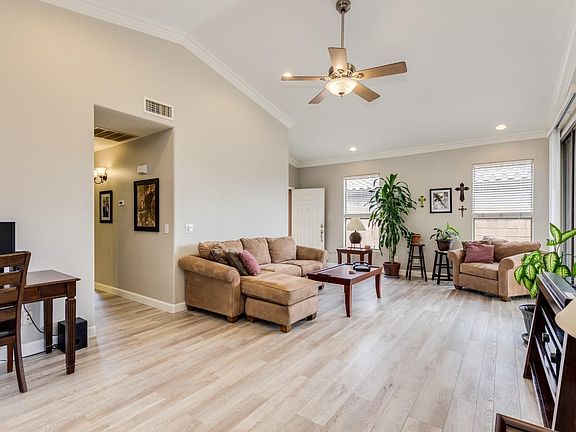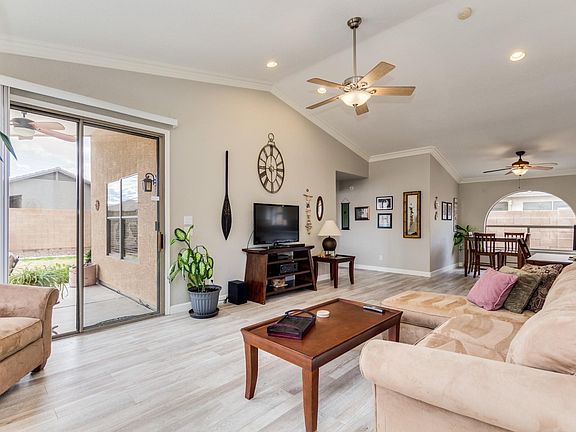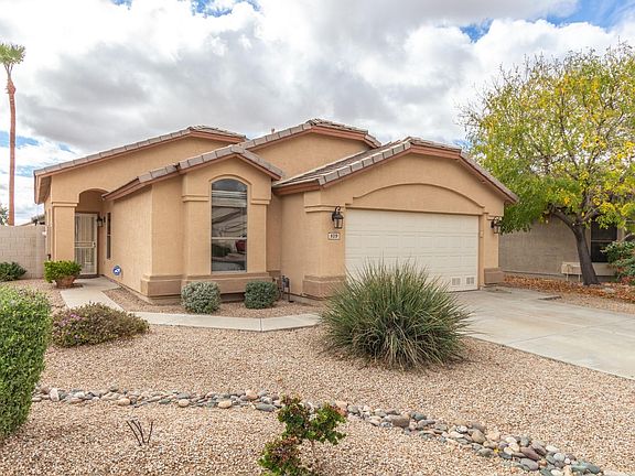 Come explore the peace and serenity that this 3BR/2BA charmer offers. Modern engineered wood in the main living areas and a cool and neutral paint scheme adds to the airy feel. Lovely granite countertops in the kitchen. Crown molding, SS appliances, recessed lighting, ceiling fans throughout. Split floorplan with airy, vaulted ceilings. Master retreat has seamless glass shower, separate tub, and walk-in closet. Ample storage cabinets in the garage. Two water heaters (one solar to help reduce costs). Quaint backyard with covered patio, and handy storage shed. Mesquite Canyon subdivision...with easy access to HWYs 202 and 60. Close to Dignity Health Hospital and Augusta Ranch Golf. Community park with basketball court, kid's play area, BBQ grill, and walking paths is just steps away.
