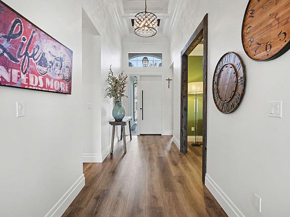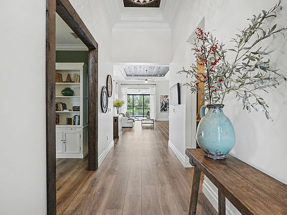 Experience country club-style living without the membership in this impeccably maintained 3-bedroom, 3-bathroom residence with a den, thoughtfully designed with a desirable split floor plan and seamless open-concept layout. Enhanced by southern exposure, the home enjoys optimal natural light and sun-filled backyard living throughout the day.Impeccably maintained and thoughtfully upgraded, this residence offers a refined blend of luxury finishes, modern systems, and effortless indoor-outdoor living. The open-concept interior is highlighted by newly installed high-end laminate flooring throughout, while the concrete slab has been professionally treated and sealed with a moisture barrier, ensuring long-term durability and peace of mind. Tray ceilings accented with dark stained wood add architectural depth, and an electric fireplace anchors the main living space with warmth and understated elegance.
