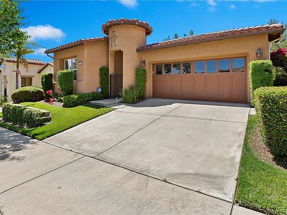 Popular Laguna Model with 1,888' sq ft of living space sporting formal entry, formal dining room, dual ensuites, office/flex space/3rd bedroom, family room with cozy fireplace and dramatic large, curved window framing the beautiful views of the golf course and mountains. Gourmet kitchen with counter seating, butler pantry, interior laundry room. Exterior integrated patio covered area for patio seating and outside enjoyment. LARGER BACK YARD THAN MOST TRILOGY HOMES. Fabulous 55+ gated community with pools, gym, walking/jogging track, bocce ball, pickle ball, tennis, formal ballroom, lots of clubs, secured mailroom and lots of activities and events to enjoy. Public golf course surrounds community and the house perches on hole 1 of the Ted Robinson designed golf course at Trilogy at Glen Ivy Southern California's most sought-after 55+ Active resort-like lifestyle.