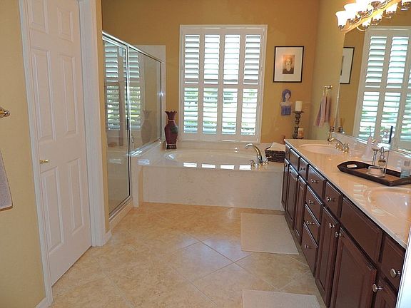 Golf course beauty with upgraded landscaping, pavers on driveway and walkway, 2-car garage plus golf cart garage. Roof re-shingled 2014 and exterior painted 2012. Loaded with upgrades: 18'' ceramic tile set on diagonal, quartz kitchen counters, new stainless steel appliances, upgraded cherry kitchen cabinets. Master suite has double-door entry with crown molding and plantation shutters on sliders, large walk-in closet, dual sinks in master bath plus garden tub with separate shower. Upgraded toilets recently installed in both bath rooms. Large inside laundry with cabinets and utility sink. Gas hot water heater. Enclosed lanai under heat and air. New attic insulation 2015. Whole-house natural gas standby generator (capable of wifi monitoring) 2021. New disposal 12/3/2015. New HVAC system with Mutli-stage energy efficient heat pump installed 2021 and has 10 year manufacturer's warranty. Water softener. Screened in large paver patio (birdcage) with matching paver knee wall and inset lighting. Extra exterior security lighting, switch controlled