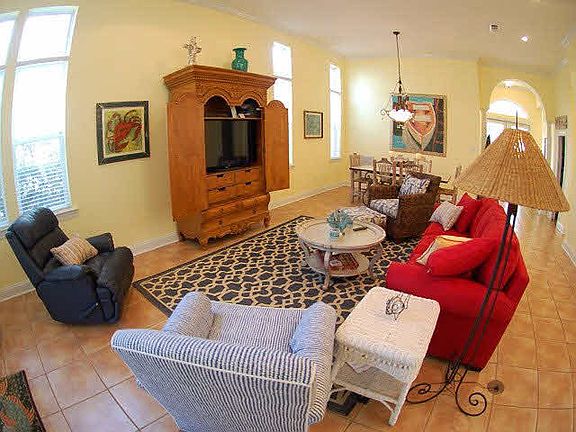 Rare one story beach home. 12' ceilings throughout. Located in a quiet cul de sac across from the indoor/outdoor pool and club house.Tile throughout living area with carpet in bedrooms.Large master suite that opens onto a a screened porch overlooking one of Martinique's natural waterways. If you're looking for privacy - this has it.