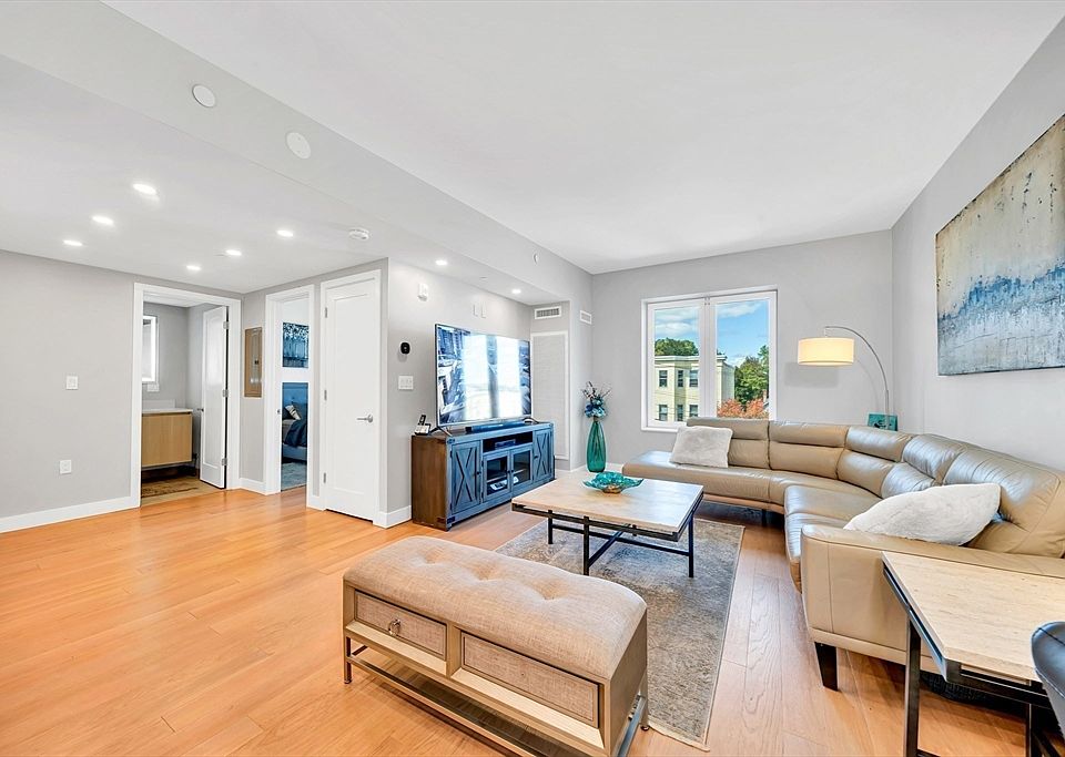 Modern 1-bed condo with garage parking in a prime Chelsea location! This bright corner unit offers 631 sq ft of stylish living space, featuring hardwood floors throughout, oversized windows, and central air. The open-concept living room flows seamlessly into a sleek kitchen with stone countertops, recessed lighting, and stainless steel appliances including a dishwasher, microwave, and gas range. The bedroom fits a queen and includes a custom built-in closet. Enjoy a spa-like bathroom with stone tile and a modern vanity. Additional perks include in-unit laundry, intercom security, and shared roof deck access. Located in a well-maintained elevator building near shops, restaurants, public transit, and commuter routes just minutes to Boston. Available Now. Initial lease through summer 2026 with option to renew for additional 12 month terms.