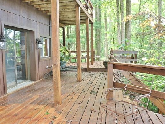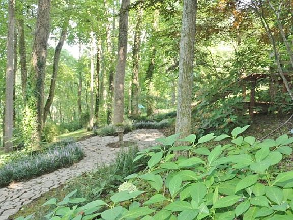 - EXTERIOR FEATURES: Wood Deck, Landscaped, Trees, Exterior Lights, Gravel Drive, Patio, Garden Space, Circular Drive