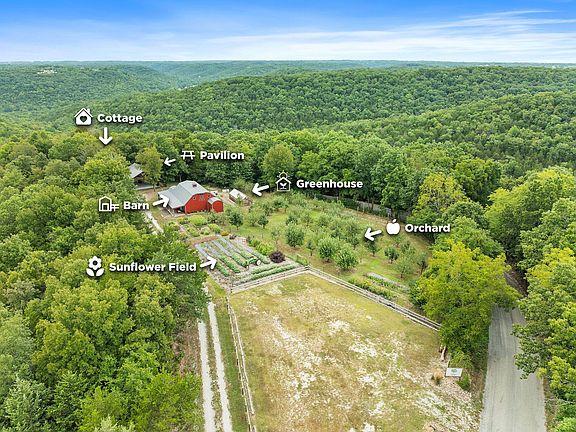 Rare Opportunity! A beautiful hobby farm with amazing features! Flower Farm - Orchard - Airbnb Cottage - Pavilion. The perfect place to put your small business dreams into action! Located in the serene hills just north of Branson, with the popular Bear Creek Winery practically next door. This gorgeous 4.67-acre property offers a ideal blend of natural beauty and modern amenities, making it an ideal setting for a peaceful rural lifestyle with added income potential. Key Features: A FLOWER FARM which has a reputation of yielding beautiful wildflowers, late summer sunflowers, and a dazzling tulip festival each spring. ORCHARD: Featuring 12 different kinds of apple trees, this beautiful orchard invites you to take a stroll and pick your own apples. AIRBNB COTTAGE: Recently built to high-quality standards, this cozy cottage has a spotless reputation and a strong booking history. It features one bedroom and bath on the main level and a loft bedroom upstairs--ideal for guests or extended family. BARN: A versatile space that was previously used as living quarters and more recently as a farm store. It could be converted into additional living space, a workshop, or a hobby area. Plus, the property features a beautiful GREENHOUSE and a stunning timber frame PAVILION. This exceptional property offers endless possibilities, whether you're looking to create a private sanctuary, entertain guests, or explore small-scale farming. The unique zoning of this property makes it extremely versatile. Make your rural living dreams a reality!