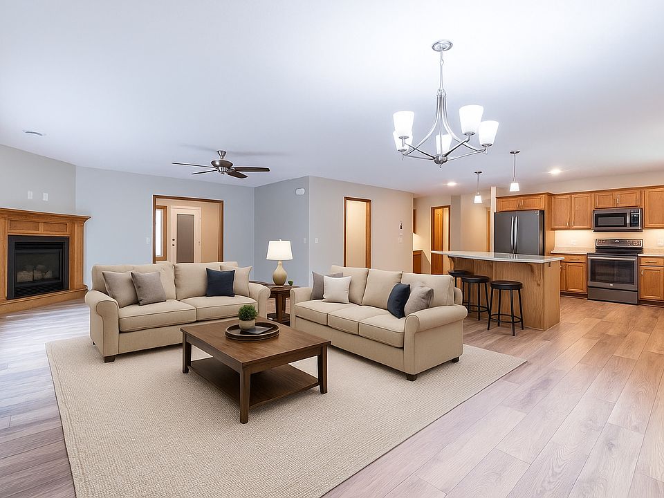 Cozy fireplaceOpen-concept layoutStainless-steel appliancesGranite countertopsModern kitchenIn-floor heatCorner-lot setting