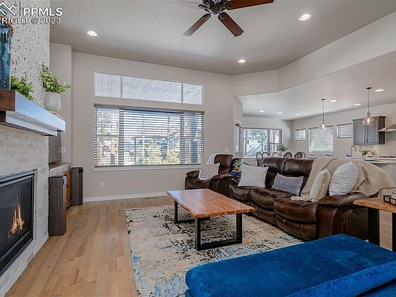 Why Wait To Build??? Move right in to this upgraded Vantage home that is BETTER THAN NEW! This gorgeous rancher is situated on a premium treed lot with views of Pikes Peak and the front range in the coveted Sanctuary Pointe neighborhood* In the highly sought after school district #38*Walk into the bright & open great room that features 3 inch hardwood floors, a cozy gas fireplace showcased by a warm white brick finish, complete with a custom mantel*The beautiful gourmet kitchen is an entertainer's delight featuring charcoal cabinetry & gorgeous quartz countertops, a full-sized pantry, extended butler's pantry, coffee bar, stainless 36" gas cook-top w/chimney hood, Samsung stainless steel appliances, and seating for 4 at the oversized breakfast bar/island* There is a separate dining area that walks out to the 18x18 covered patio* Take in the peace & quiet in the serene fenced yard nestled in the pines with your morning coffee*Rear patio has a gas connection for easy grilling and enjoying smores around the fire pit* Soak away all your cares of the day in the relaxing new 6 person jetted hot tub*The private main level master retreat includes an upgraded spa bath w/a glass-enclosed zero-entry shower,dual vanities & a walk-in closet*There is a 2nd large bedroom that could also be a perfect study or play room & a full main level guest bath*Convenient main level laundry room with wash sink & upgraded cabinets & a boot bench with cubby storage in the mud room right off the 3rd car garage*The fully finished basement includes a large rec room & game room perfect for a billiards area with wet bar, 2 oversized bedrooms, 3/4 guest bath & extended ceiling height*2 additional BA rough in's for future BD/BA expansion if needed* Great location near Colorado Springs, Denver, amenities, schools & the Air Force Academy* Just steps from forest trails, new park & Fox Run Park is easily accessible via a tunnel that goes right under Baptist Rd* This is true Colorado living at it's FINEST!!