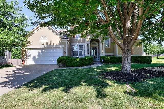 Hard to find Traditional 1.5 Story with Master Suite on the main level. New carpet, upstairs bath flooring, paint. Gorgeous floor to ceiling windows in the Living Room for natural light! See through Fireplace between the kitchen-breakfast room and Living Room. Good size bedrooms and full bath on the 2nd Floor. Laundry and 1/2 bath on the main level. Great location on a cul de sac. Close to shopping, highway access and restaurants. Patio and Privacy Fence around the very large backyard! New HVAC 2021. NKC Schools - Staley High attendance area. Don't miss this one!