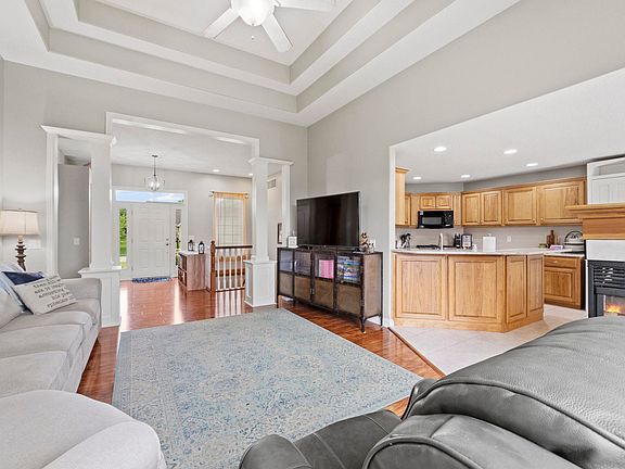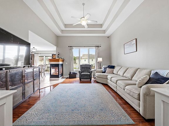 Here is a sought after ranch on full finished basement in one of the most established neighborhoods in Leo... welcome home to Pioneer Village! This is a solid, Amish-built brick front home with new exterior light fixtures and an attached 3-car garage. Soaring ceilings welcome you in the foyer, which lead directly to the open concept living room, which has built in decorative columns, tall tray ceiling accents and a ceiling fan. The 2-way gas fireplace can be enjoyed from the living room or the large eat-in kitchen. The bright and open kitchen has granite countertops, undermount solid-surface sink, and stainless steel appliances. There is a spacious laundry room on the main floor, just off the garage, and a private hallway which leads to the primary main floor bedroom suite. The suite is fitted with tray ceilings and a large bathroom that has 2 separate sink areas, a jetted tub, separate shower, and walk in closet. The split bedroom plan means that there are 2 other bedrooms located on the opposite side of the home, equipped with a shared bathroom between. The daylight basement is fully finished with 3 separate spaces: a large entertaining/living space, a room that can be used as a bedroom (doors, window, and room to add closet storage), and an additional large bonus room that could work great as an office, media space, or exercise room.