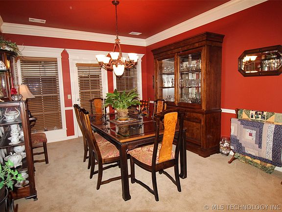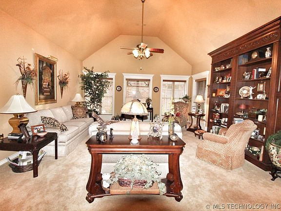 Lovely home in Ashton Hollow Villas gated community. Hard to find! Jenks Schools, One owner, immaculate single-story custom-built home. This home features 3 bedrooms, 2 baths, tall open entry, wide crown molding, granite & back splash in the kitchen, gorgeous hardwoods in the hallway, kitchen, and great room with fireplace. Open Living and Dining room. Beautiful sun room exits to outdoor patios off of kitchen. 2 car garage with safe room and lots of cabinet storage. Beautifully landscaped yard.