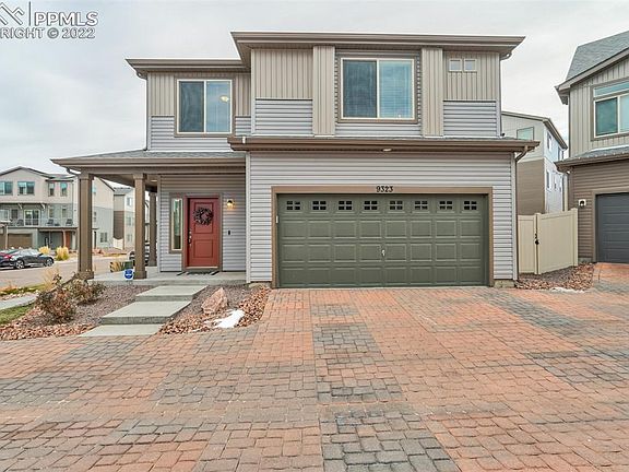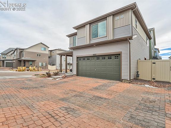 Enjoy lower maintenance living in the fabulous Banning Lewis Ranch Community!This 2 year new adorable home is located on a corner lot with a unique brick paver cul-de-sac type driveway and the back yard has a privacy fence! A covered porch sets the stage for charm! This home has 9 foot ceilings throughout the main level with trey ceilings in foyer and great room.The open living space makes entertaining family and friends a breeze while the picturesque windows allow for a lot of light providing a cheerful feel throughout. The family room has a cozy fire place and the space opens to the kitchen. The extended granite island offers counter seating and is ideal for entertaining. Upstairs is the Primary Suite is bright and spacious and offers a private bathroom with double vanity, and walk-in closet. A second bedroom and bathroom are also upstairs. Enjoy a large open loft has so many options for use like a family space, a play area or home office; or it could be converted to a 3rd bedroom. The laundry room is conveniently located upstairs as well. Front yard landscaping is maintained by HOA, especially helpful since this is a larger corner lot! The backyard has a privacy fence, and is thoughtfully xeriscaped including a few artificial turf pads. This community offers award-winning K-8 School Banning Lewis Ranch Academy. Clubhouse with 24-hour fitness room and outdoor Jr. Olympic heated pool, splash park, tennis courts, 60+ acres of hiking trails and parks, trash removal, recycling services, front lawn care, snow removal and much more! It is conveniently located to the Powers Corridor, Woodmen, and easy access to multiple military bases.