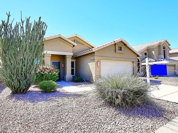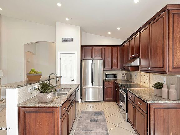 Wonderful, quiet neighborhood in N Scottsdale. This completely updated single-level home includes all the extras: granite counters, cherry cabinets, new SS KitchenAid refrigerator Bosch dishwasher and ceramic tile throughout. The primary bathroom features an oversized shower, separate tub plus Robern lighted bathroom cabinets. This home is full of natural light and has just been freshly painted. Family room boasts vaulted ceilings. a cozy fireplace and is open to the kitchen. Brand new windows and an epoxy garage floor and newer (1yr) washer and dryer. The yards are landscaped for easy maintenance and the backyard is very private with a covered patio.